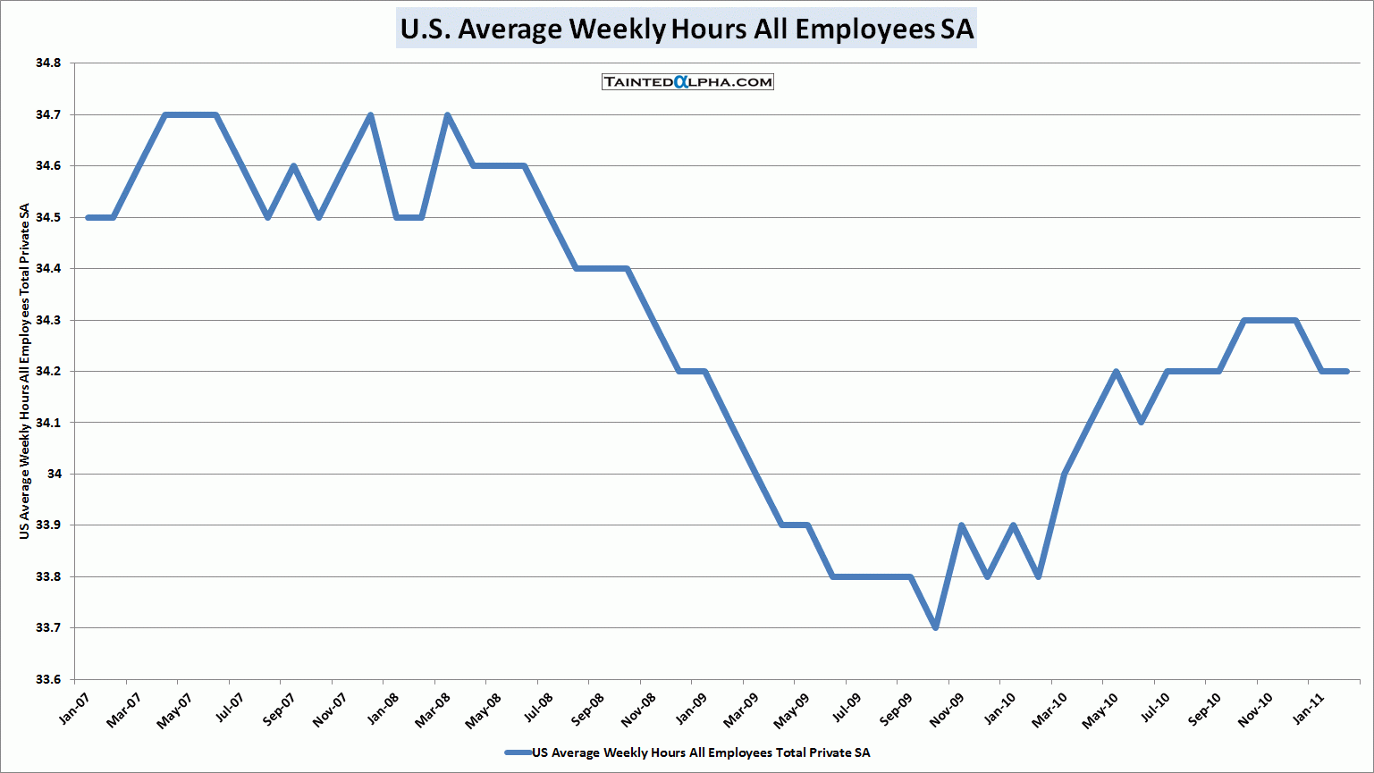 Average weekly hours worked for private employees unchanged at 34.2.