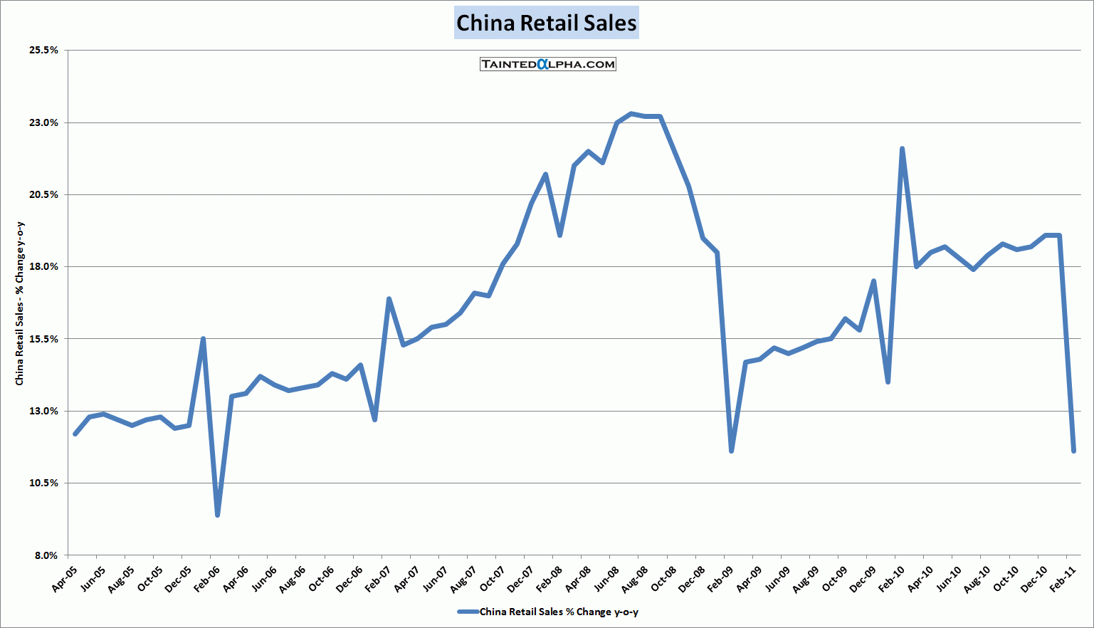 China retail sales rose 11.6% in February vs. 19.0% consensus. January reading was not reported.