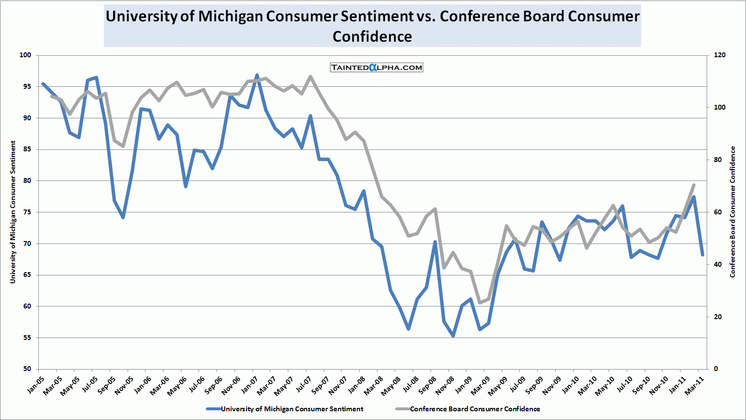 Conference Board Consumer Confidence, University of Michigan/Reuters Consumer Sentiment