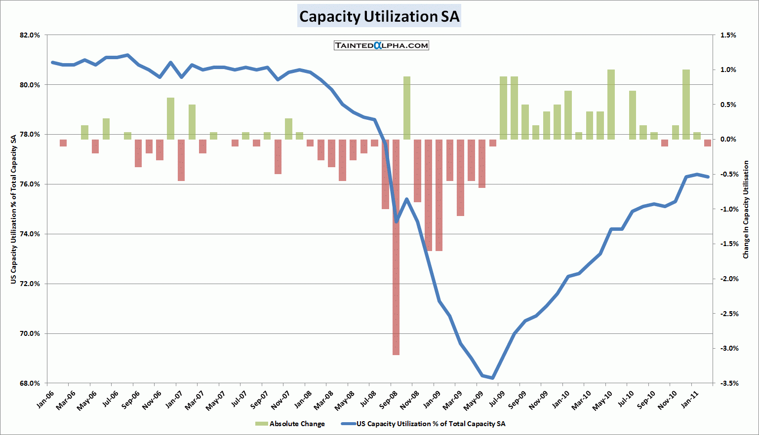Capacity utilization fell to 76.3% from revised January reading of 76.4% ( from 76.1%); Consensus was at 76.5%.