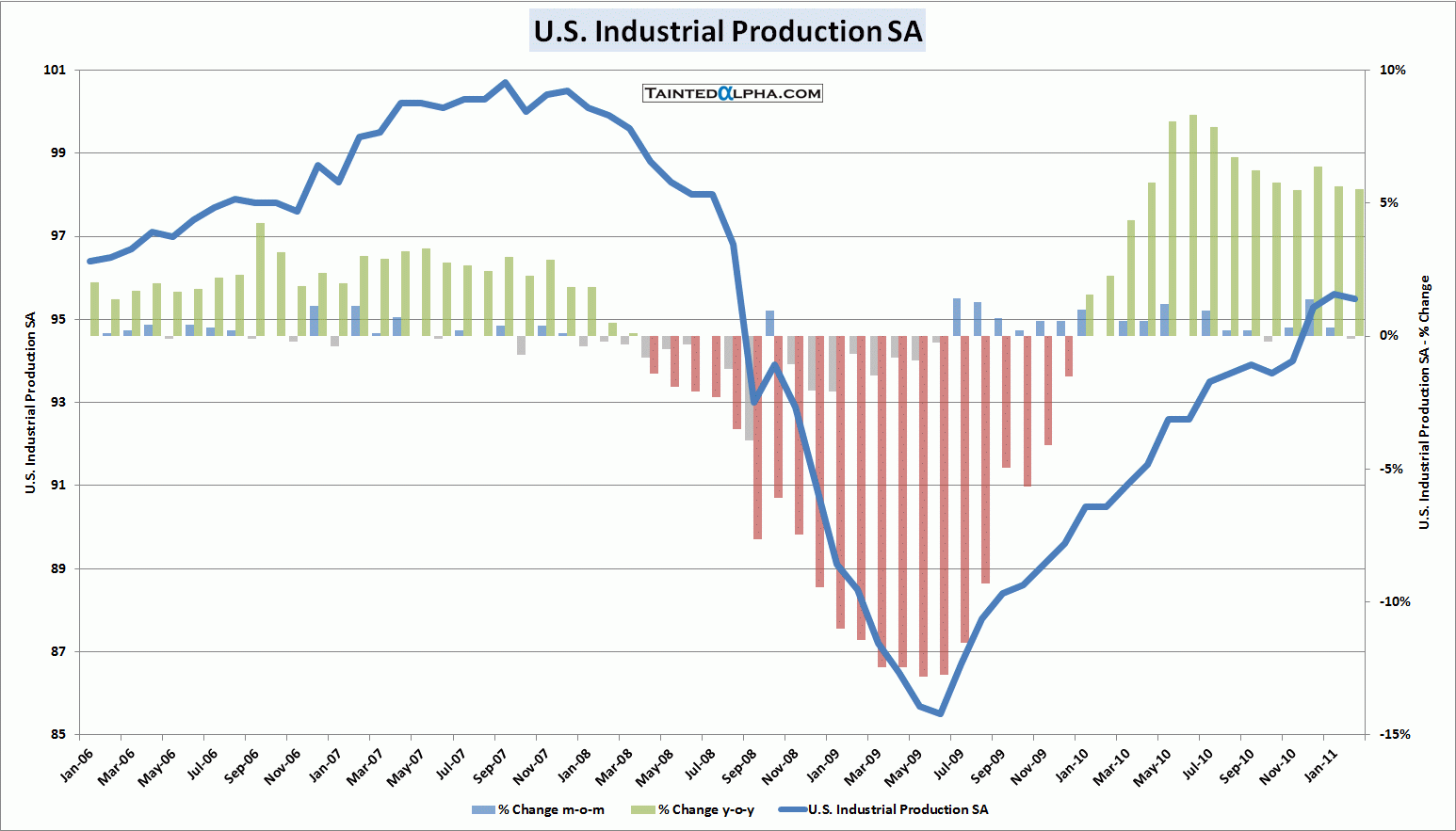 U.S. industrial production fell 0.1% in February. The consensus was at 0.6%, January revised (up 0.4%) reading was at 0.3%. On year level industrial production is up 5.5%.