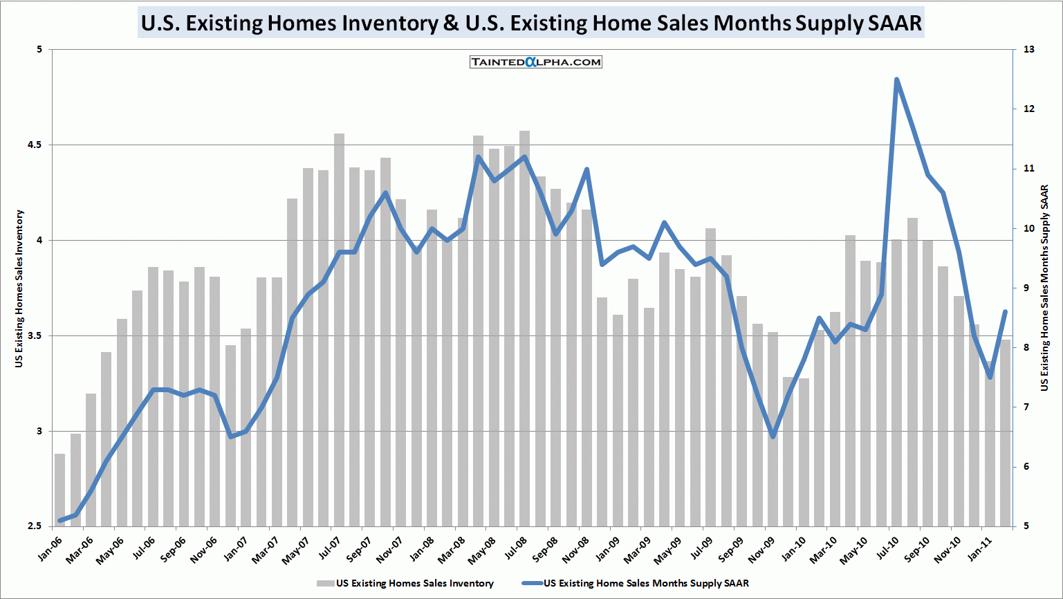 Total housing inventory is at 3.5 million units up from 3.4 million in January. Months supply rose from 7.5 to 8.6 months.
