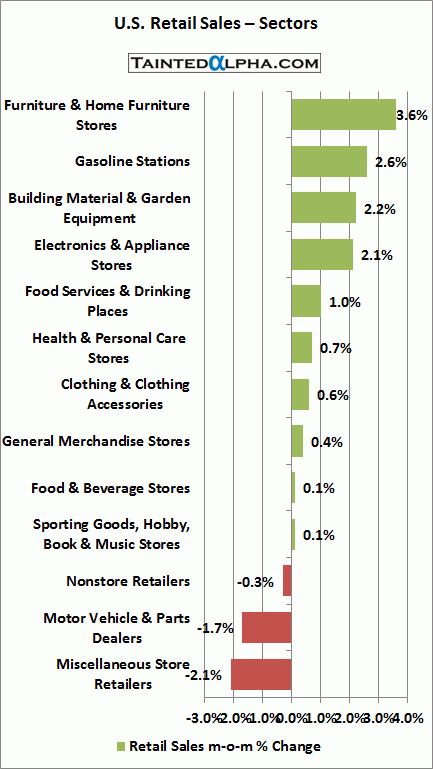 Most notable gainers: furniture & home furniture stores 3.6%, gasoline stations 2.6%, building material & garden equipment 2.2%;