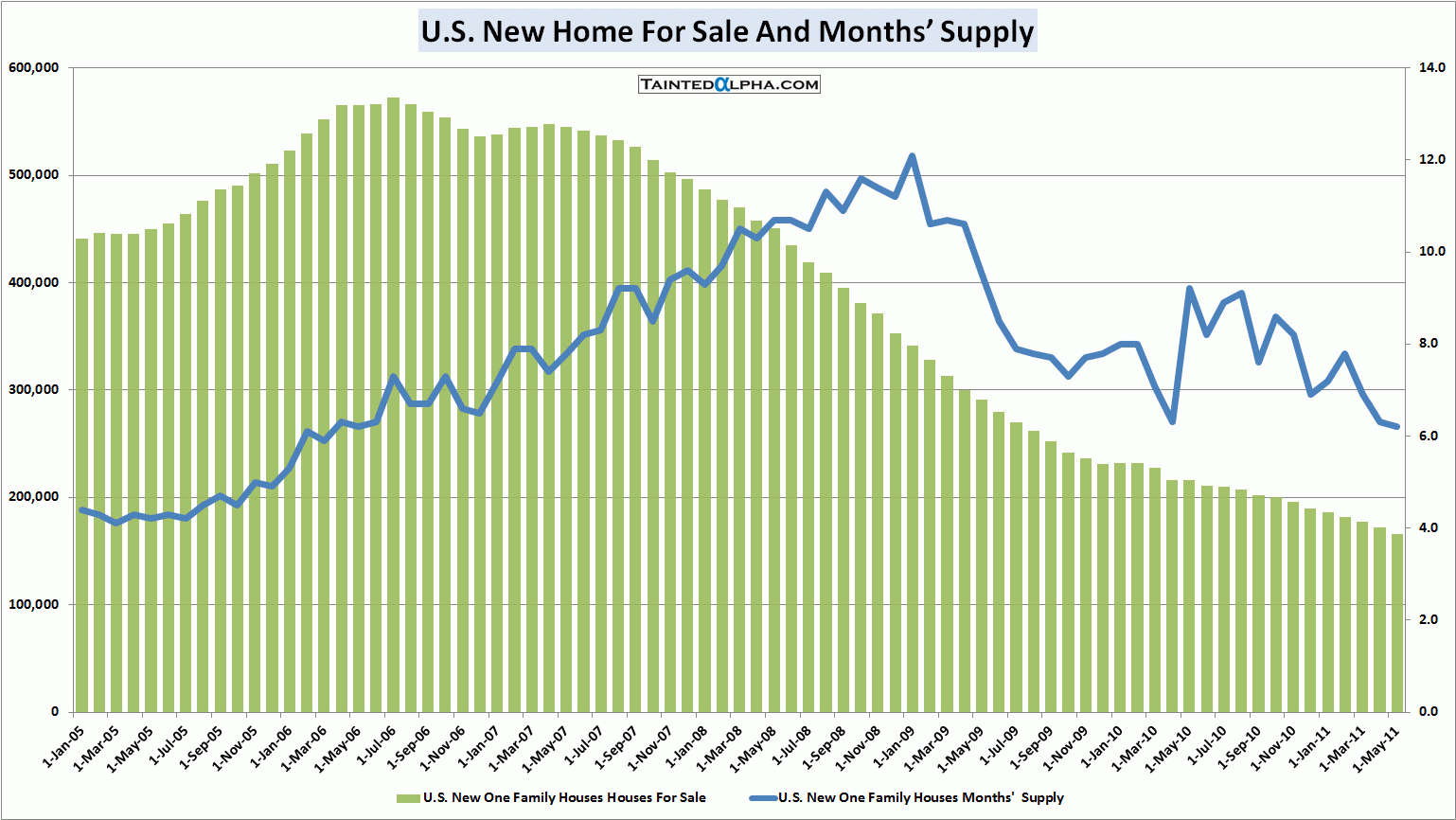 Month of supplies fell from revised 6.3 to 6.2 months. Backlog of unsold new homes is at 166.000.