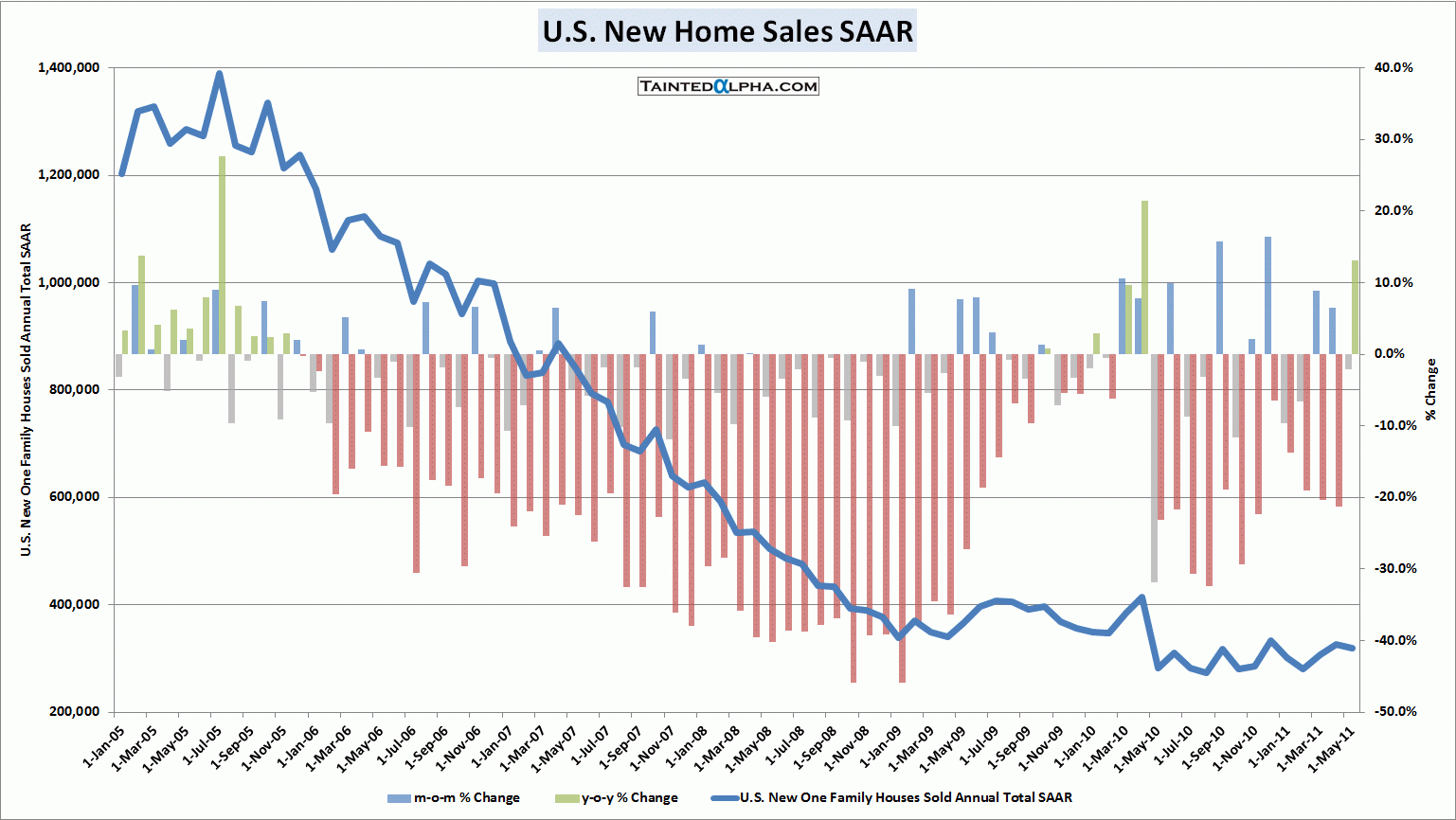 U.S. new home sales fell 2.1% to 319.000 SAAR; Consensus was at 305.000 SAAR, prior reading (revised upward 3.000) was at 326.000 SAAR.