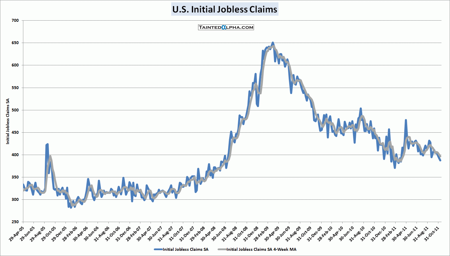 Initial jobless claims in the U.S. were reported at 388.000 vs. 395.000 consensus and last week revised (up 3.000) reading of 393.000.