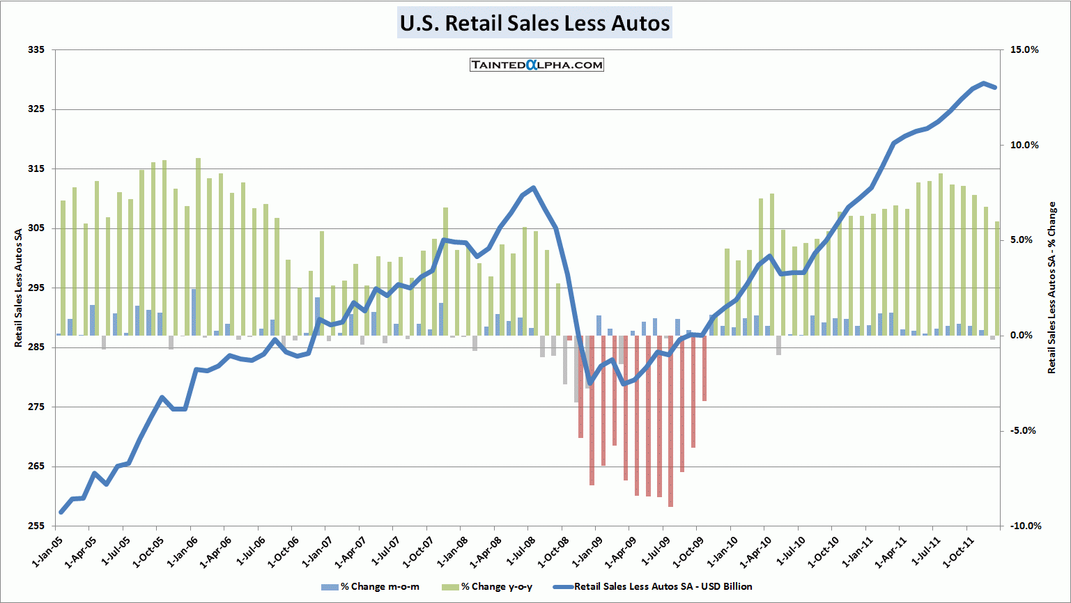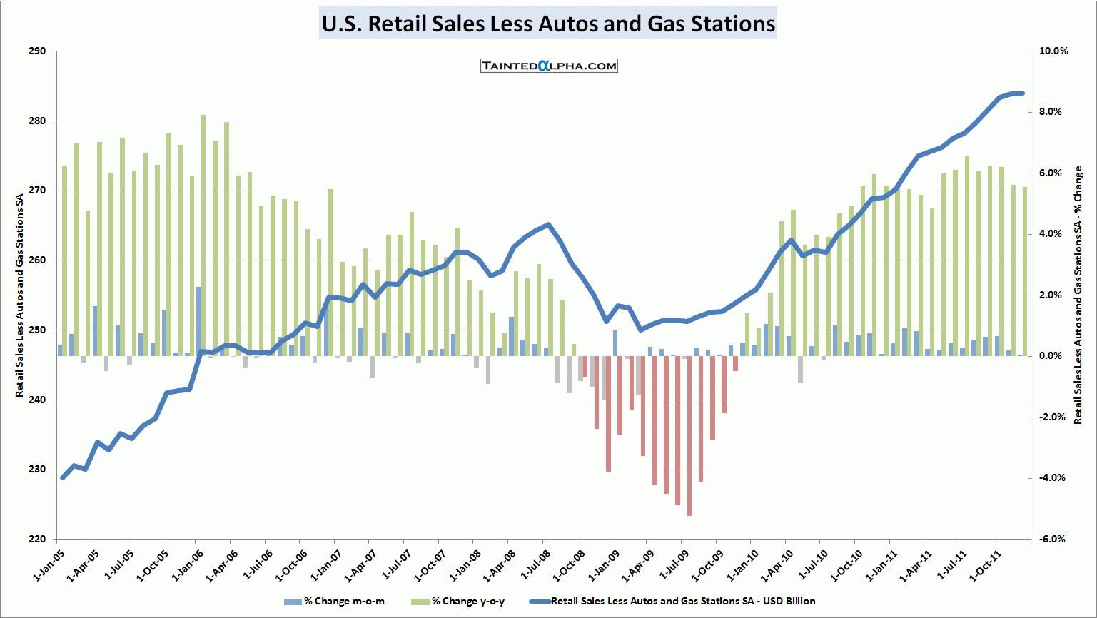 Autos and gas station taken out, the retail sales were unchanged. Consensus was at 0.4%. Prior reading was at 0.2%. In 2011 retail sales less autos and gas stations were up 5.5%.