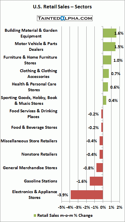 Most notable losers: electronics & appliance stores -3.9%, gasoline stations -1.6%, general merchandise stores -0.8%.