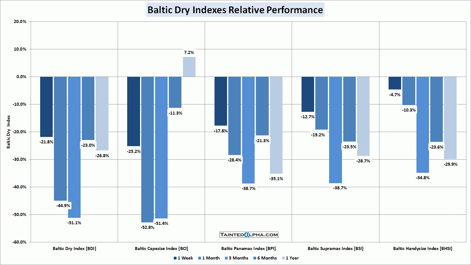 Baltic dry index fell 21.8% last week; Capesize Index was down 25.2%; Panamax Index fell 17.8%; Supramax Index was down 12.7%; Handysize Index fell 4.7%.