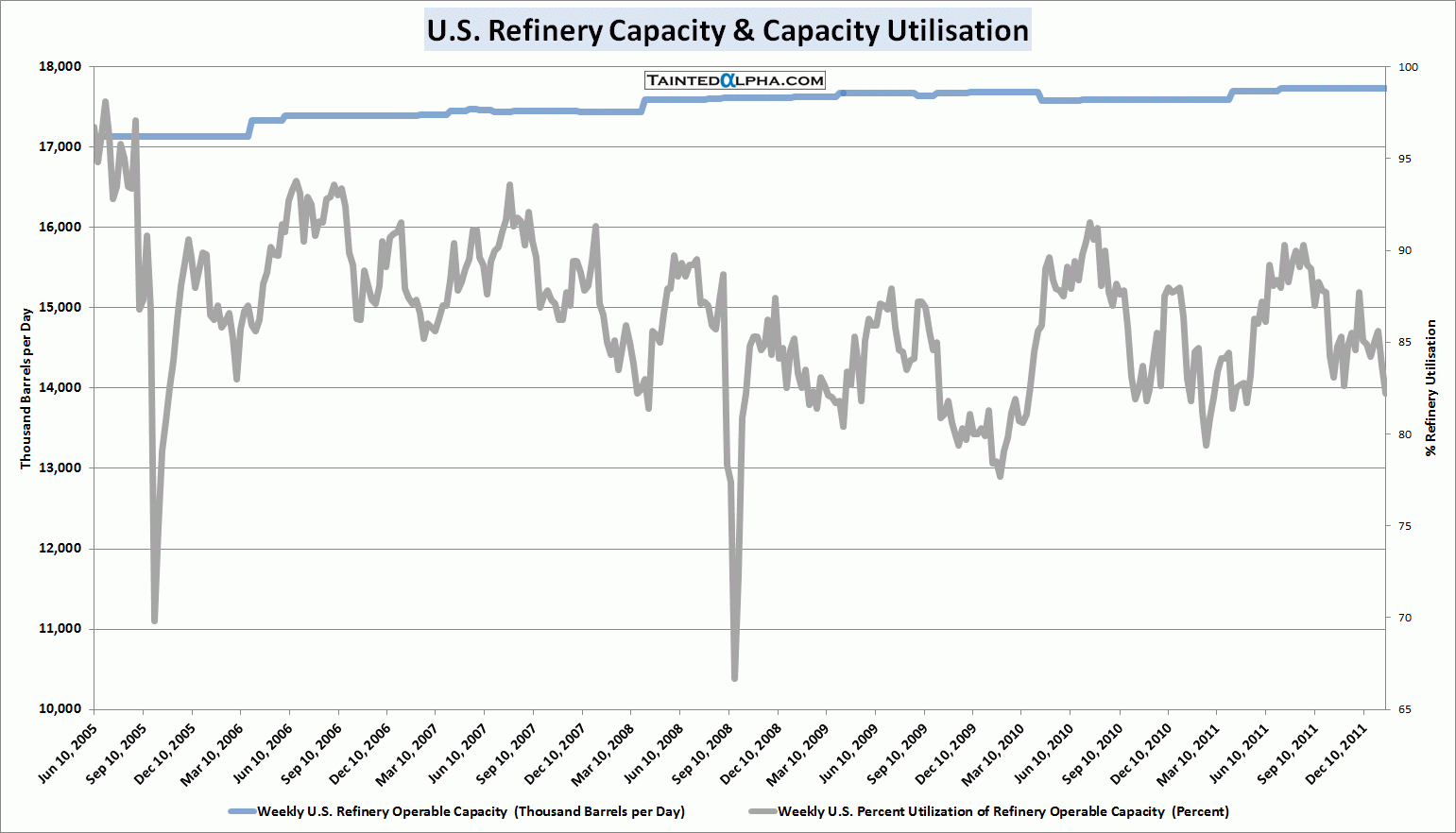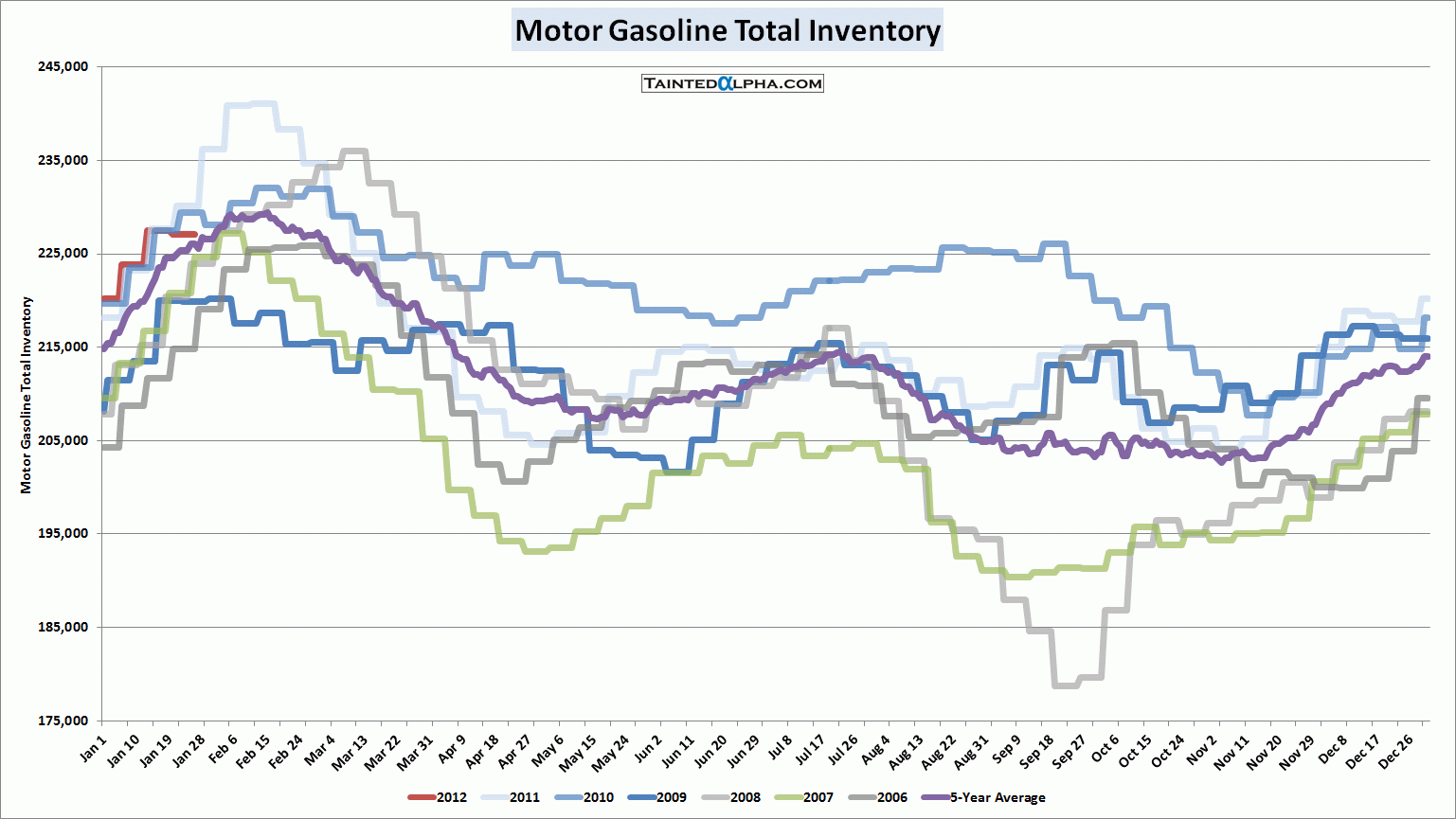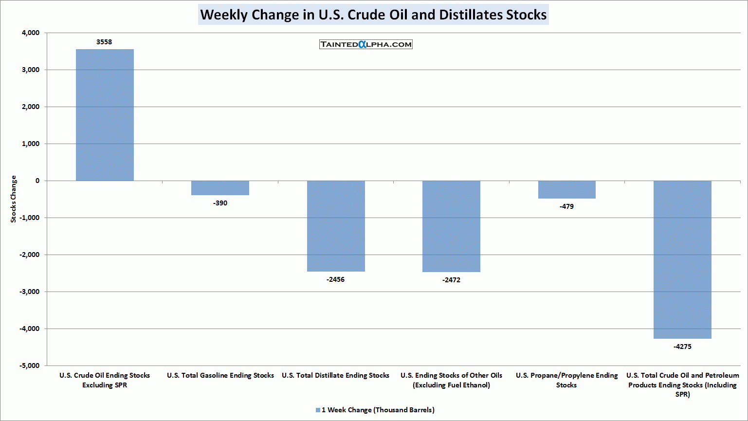 Crude stocks rose 3.5 million barrels; Gasoline stocks were down 0.4 million barrels; Distillate stocks fell 2.5 million barrels; Propane/propylene stocks fell 0.5 million barrels; Other oils stocks fell 2.5 million barrels; Total crude oil and petroleum stocks were down 4.3 million barrels.