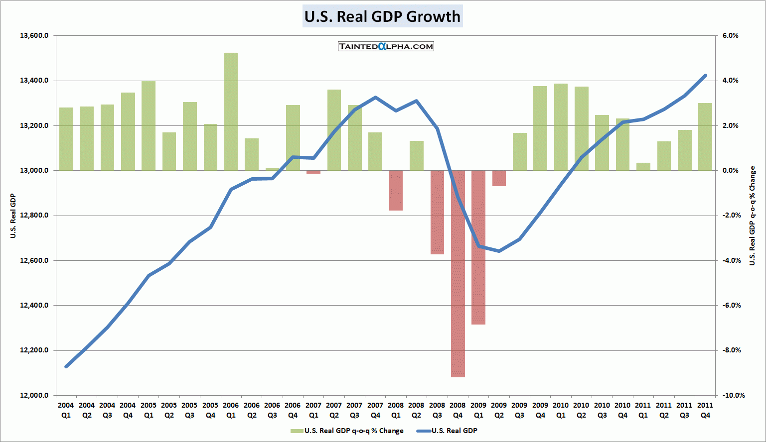 U.S. GDP growth for Q4 was revised yesterday from 2.8% to 3.0%; consensus was at 2.8%. Q3 2011 reading was at 1.8%.