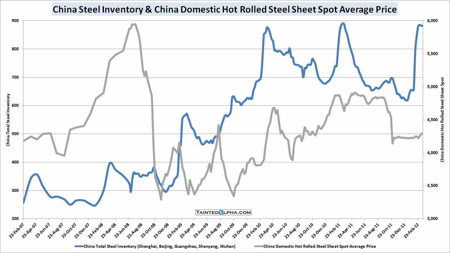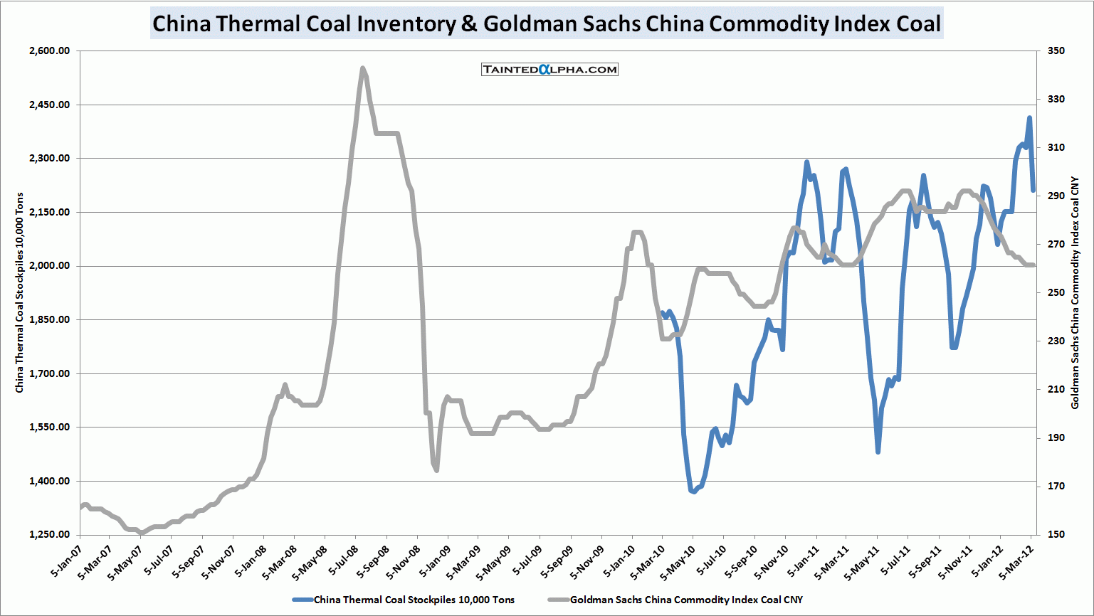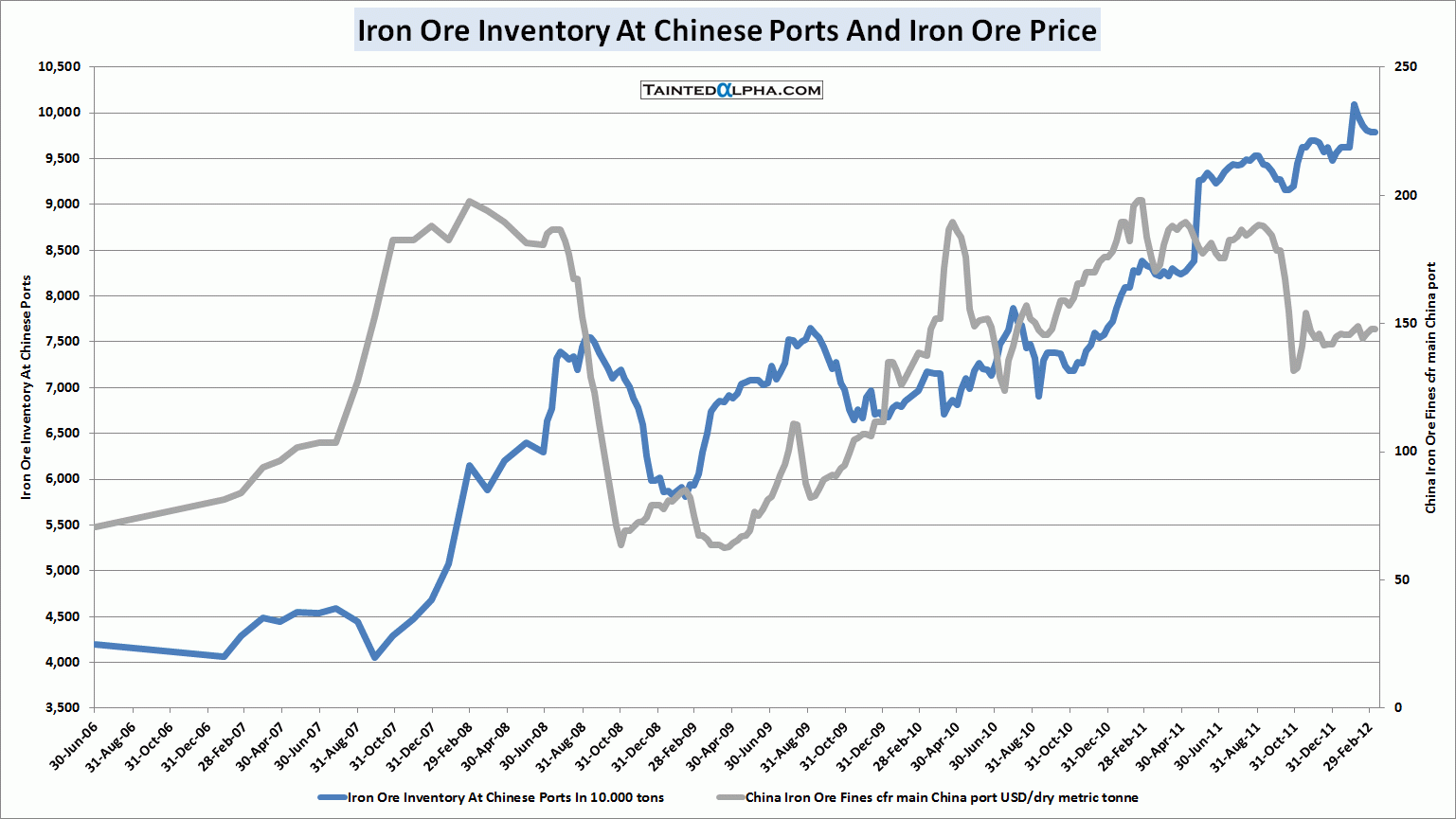 Iron ore inventory at Chinese ports close to all-time high; price pretty much unchanged. Steel stockpiles spiked upwards while price remained flat. Thermal coal inventory fell from a all-time high reached this year, price moved lower.