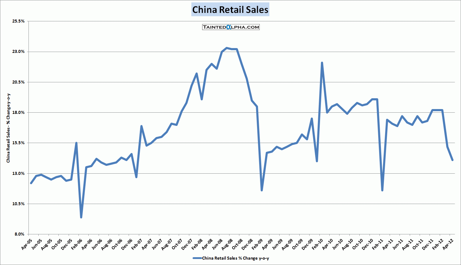 China retail sales rose 14.1% y-o-y in April vs. 15.2% March reading. Consensus was at 15.1%.