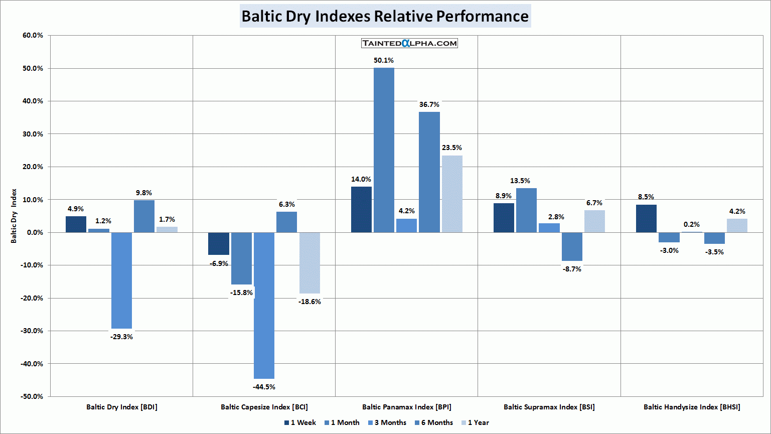 Last week Baltic Dry Index rose 4.9%; Capesize Index was down 6.9%; Panamax Index rose 14.0%; Supramax Index was up 8.9%; Handysize Index rose 8.5%.