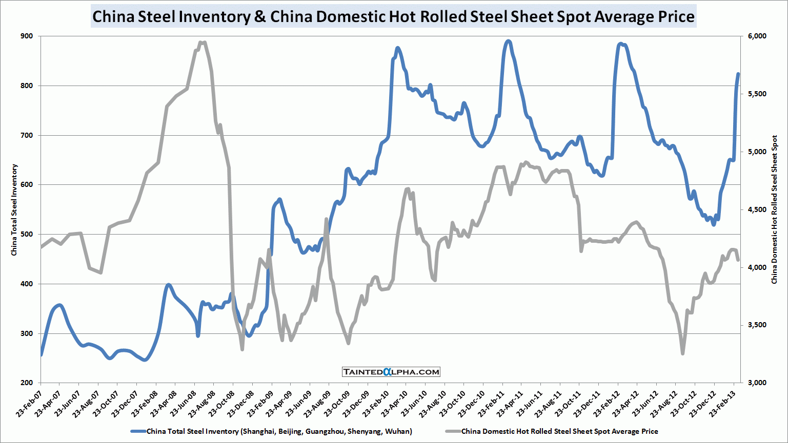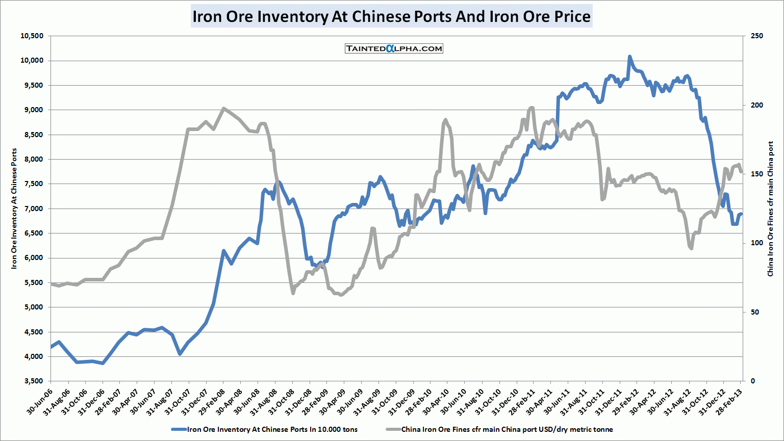 China steel and coal inventories edged up while their prices moved down. Iron ore inventory on the other hand moved down, while price showed some signs of recovery. Overall the demand in these markets seems weak.